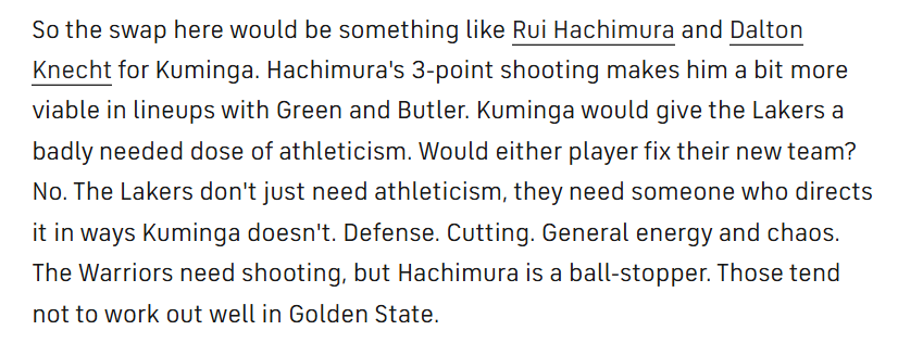 但这笔交易能让两支球队的问题得到根治吗?答案是否定的。湖人队需要的不只是运动能力,他们更需要一个能将这种优势转化到防守、无球切入,以及用积极性搅乱对手防线的球员——而这恰恰是库明加不擅长的。勇士队则需要外线火力,可八村垒是个持球停滞点,这种类型的球员在勇士的体系里往往很难立足。